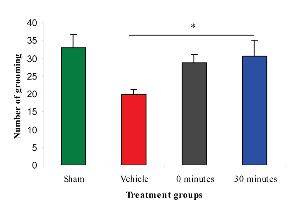 Effect of 100 μg/rat of i.c.v. L-2286 on grooming in open-field test (*p < 0.05 compared to vehicle-treated animals).