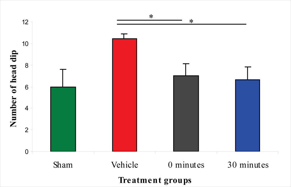 Results of the elevated plus-maze test indicate that the vehicle-treated animals suffered from anxiety after injury. A statistically significant difference between the sham-injured and vehicle-treated groups was detected in the number of head dips in the open arm, time in the open arm, time in the closed arm, and the amount of grooming in the closed arm. The anxiety level was significantly lower in the L-2286-treated group than in the vehicle treated animals, since rats spent significantly more time in the “unsafe” open arm than in the “safe” closed arm. Interestingly, the group treated immediately post-injury not only spent significantly more time in the open arm than the vehicle treated group, but also the sham-injured group, a finding not observed in rats treated 30 min post-injury. The vehicle-treated and the latter group significantly differed only in the parameters of head dips in the open arm, time in the open arm and time in the closed arm (Figure 8–10).