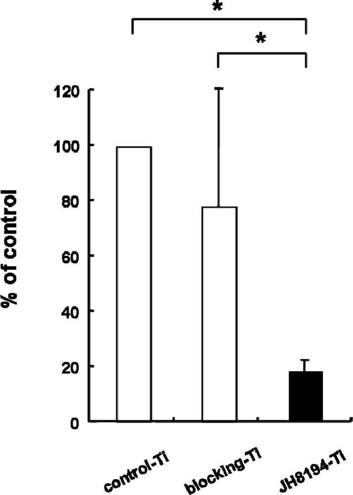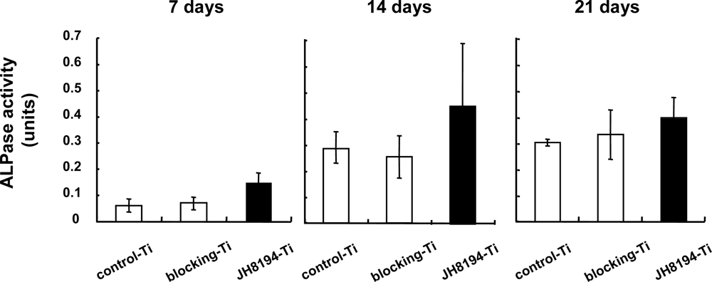The effects of JH8194-Ti on ALPase activity. ALPase activity and total protein in the solved supernatant with 0.2% TritonX-100 in saline of each cell grown on control-Ti, blocking-Ti and JH8194-Ti during 7, 14 and 21 days were measured in accordance with the method described in Materials and Methods. ALPase activity per one mg protein (units) was calculated. Data represent the means ± SD of triplicate experiments. Three independent experiments were carried out. (ANOVA, p >0.05)