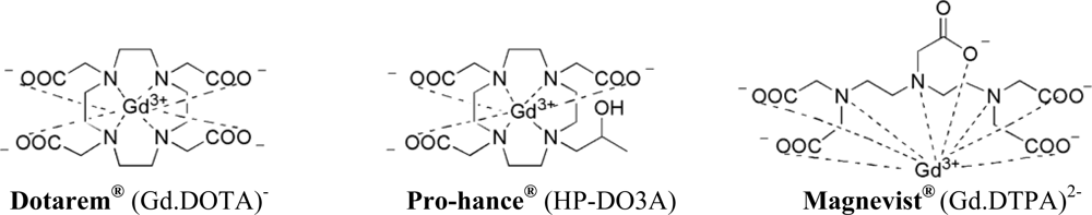 MRI contrast agents are routinely used in clinical diagnosis as they provide reliable means to interpret MR images and can also play a key role in clinical imaging [3]. In general, MR contrast agents consist of Gd3+ complexes, Mn2+ chloride complexes, or monocrystalline iron oxide nanoparticles. In complexes, a paramagnetic metal ion core is associated with a strong chelating ligand. Nowadays, the most frequently used contrast agents are thermodynamically and kinetically stable low molecular weight Gd3+ complexes that promote MRI contrast by non-specific enhancement of water proton relaxation rates within the blood pool. Gd.DTPA (Figure 1) was the first water soluble, renally excreteable contrast agent approved for clinical use, and is currently used routinely under the commercial name Magnevist® [4]. Other Gd3+ contrast agents used commonly in the clinic are also shown (Figure 1).