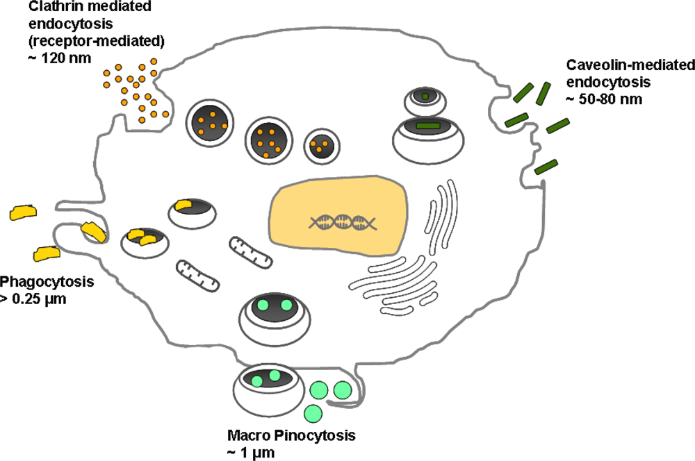 There are a number of pathways by which macromolecules and nanoparticles could enter mammalian cells, namely by phagocytosis, pinocytosis, clathrin-mediated endocytosis, caveolin-mediated endocytosis, or clathrin and caveolin independent endocytosis [1,16]. Phagocytosis is a process that mediates the uptake of large particles (1 μm) by cells and most phagocytic cells of the immune system use phagocytosis to internalise foreign bodies. These cells include neutrophils, monocytes, macrophages, and microglia. Non-phagocytic cells prefer to internalise particles using pinocytosis and it is generally considered that any non-specific internalisation into cells is due to this mechanism [1]. Clathrin-mediated endocytosis and caveolin-mediated endocytosis are much the more specific means of cellular entry.