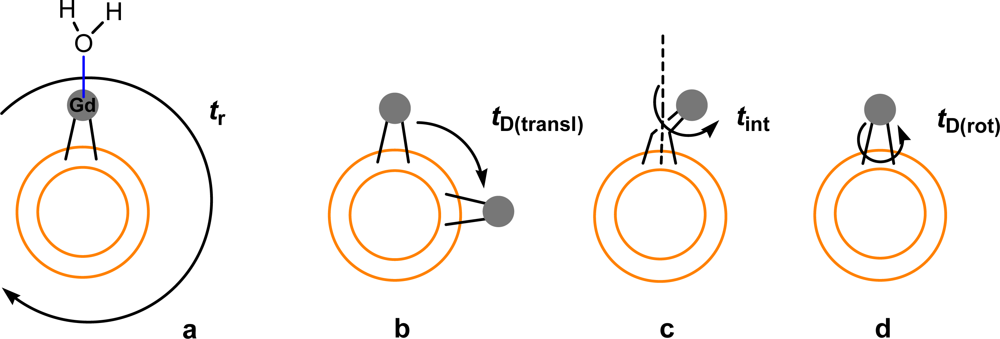 Cartoon of the possible motions that may occur involving the water molecule bound to the Gd3+ ion of the Gd lipid chelate head group. a shows the rotational motion of the whole paramagnetic liposome in water (tr), b shows the translational diffusion of individual Gd chelates protruding from the paramagnetic liposome surface (tD(transl)), c presents the rotation of the Gd chelated head group attached to the lipid tail (tint) and d depicts the rotational diffusion of the entire Gd lipid in the paramagnetic liposome membrane (tD(rot)) [42].