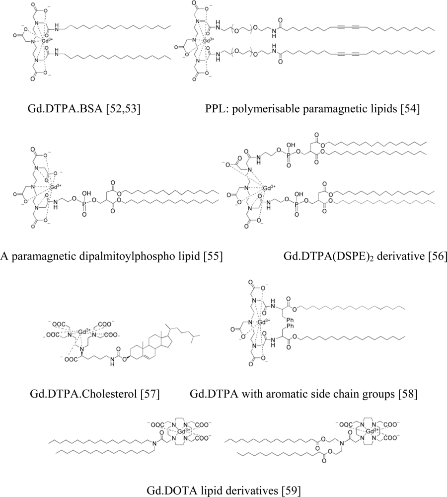 Since that time, a range of Gd lipids have been incorporated into liposome formulations to achieve paramagnetic liposomes. The principal design feature of these lipids has been the conjugation of the FDA approved Gd.DTPA MRI contrast agent moiety with lipid moieties associated in order to anchor the Gd chelate into liposome bilayers. Some examples of paramagnetic Gd lipids synthesised by various research groups are presented (Figure 5).