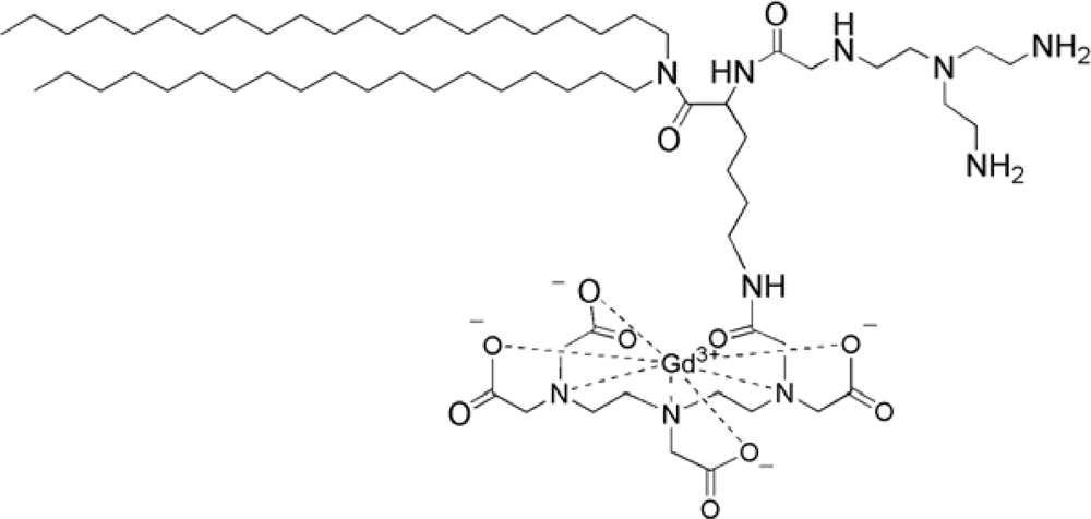 Leclercq et al. have reported the design and synthesis of an alternative paramagnetic Gd lipid with an additional functionality which further demonstrates additional advantages of liposome systems [60]. This novel bi-functional Gd lipid MCO-I-68 (see Figure 6) comprises a cationic head group for DNA binding and condensation. Consequently, cationic liposome-mediated transfection of NIH 3T3 cells was observed in vitro using cationic liposomes formulated from MCO-I-68 and transfection of mouse tumours in vivo was also observed following intratumoural injection. In this instance, transfection efficiency was determined throughout using concomitant MRI measurements. This is an excellent early example of a bi-functional paramagnetic cationic liposome system.