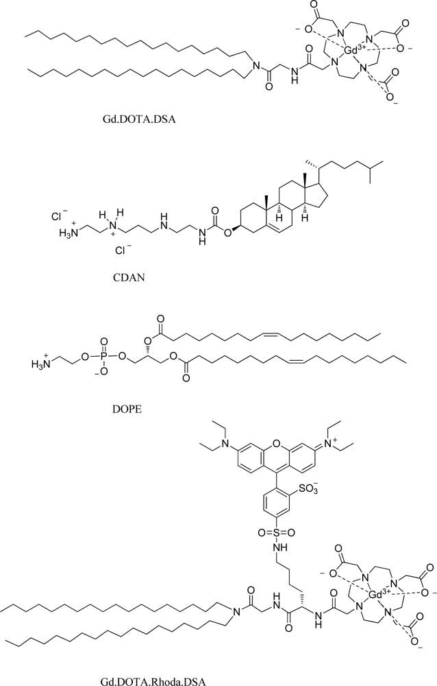 One particularly important modification of liposomes has been the inclusion of synthetic cationic lipids into bilayers such that cationic liposomes are formed. These cationic liposomes readily combine with nucleic acids to form cationic liposome/nucleic acid (lipoplex) nanoparticles that mediate functional delivery of nucleic acids to cells [22–28]. Otherwise, liposomes per se are remarkably biocompatible and have been studied as models of biological membranes [29]. Of particular relevance here, liposomes are rendered MRI active (paramagnetic liposomes) by the incorporation of Gd lipids into the bilayer structures or by the encapsulation of paramagnetic contrast agents within the aqueous cavity [30–32]. These paramagnetic liposomes have been used in a number of investigations including cellular labelling and tracking [33]. Indeed, liposomes appear well suited as carriers of a high payload of Gd3+ chelates into cells.