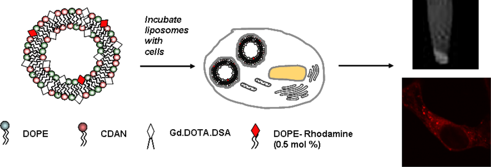 The cationic character of this particular bi-modal imaging paramagnetic cationic liposome system was conferred by the inclusion of a cationic lipid (CDAN) (Figure 7) that promotes cell surface association, cell entry by endocytosis and endosomolysis to enable liposome bilayer-associated imaging agents access to the cell cytoplasm (see Figure 8). Endosomolysis is further assisted by the lipid fusogenic character of the neutral lipid (DOPE) (Figure 7) that acts as a helper lipid in such membrane trafficking events [62–64]. The inclusion of the cationic lipid was also intended to ensure that this particular bi-modal imaging paramagnetic cationic liposome system should also be bi-functional with the capacity for plasmid DNA binding, condensation and functional delivery to cells in vitro, in the same way as MAGfect™ [33,61]. Very recently, Kamaly et al. described a next generation bi-modal imaging paramagnetic cationic liposome system prepared using the bi-modal imaging lipid (Gd.DOTA.Rhoda.DSA) (Figure 7) [65]. This bi-modal imaging lipid was found to be even more efficient than the parent Gd-lipid at enhancing water proton relaxivities and lowering T1 relaxation times.
