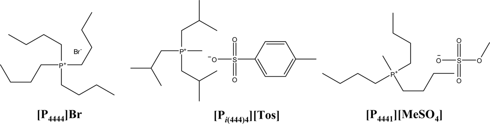 The ABS studied in this work were prepared using aqueous solutions of K3PO4 (≥98 wt% pure, Sigma) and aqueous solutions of individual ILs. The ILs studied were phosphonium-based ILs, namely triisobutyl(methyl)phosphonium tosylate ([Pi(444)1][Tos]) > 95 wt % pure, tributyl(methyl)-phosphonium methylsulphate ([P4441][MeSO4]) > 99 wt % pure and tetrabutylphosphonium bromide ([P4444]Br) > 96 wt % pure. The studied phosphonium-based ILs were kindly provided by Cytec Industries, Inc. The selected ILs cover different cations and anions and merely represent a proof of principle of the versatility of ILs that can be used for forming ABS. All the ILs’ molecular structures and respective designations are shown in Figure 1.