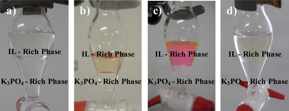 Partition coefficients (Ki) between the IL-rich and inorganic salt-rich phase were determined at 298 K for the following biomolecules: l-tryptophan (KTrp), β-carotene (Kβcarot), rhodamine 6G (KRhod) and caffeine (KCaf). The partition coefficients are defined as the ratio of the concentration of each biomolecule in the IL- and in the K3PO4-rich phase, and as described by Equation 7 (taken as example the biomolecule l-tryptophan):
