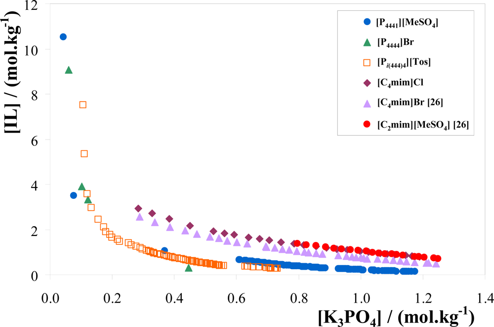 In Figure 3 there are small, but still visible, quantitative differences in the binodal curves for the phosphonium-based ILs. Considering, for instance, the fixed distance between the binodal curves and the origin at 0.4 mol·kg−1 of K3PO4, the ability of the ILs for phase separation can be described by the following order: [P4444]Br > [Pi(444)4][Tos] > [P4441][MeSO4]. Thus, at such an IL concentration, [P4444]Br has the higher ability to induce phase separation in IL + K3PO4 + water ternary systems. Indeed this IL is the one with four straight butyl chains enhancing therefore the ABS formation ability. On the other hand, [P4441][MeSO4] presents a shorter alkyl chain coupled to a salting-out inducing anion that consequently decreases the miscibility region of the ternary phase diagram. In addition, the aromatic ring in [Pi(444)4][Tos] is certainly the main responsible for its enhanced water affinity when compared to [P4444]Br. The results presented in Figure 3 show that, in general, [P4441][MeSO4] is the strongest salting-out inducing phosphonium-based IL studied while [P4444]Br is the strongest salting-in inducing IL.
