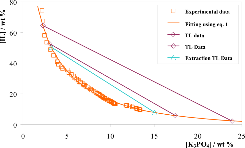 where subscripts T and B denote respectively the top and bottom phases, and X and Y are the weight fraction of inorganic salt and IL, respectively. It should be pointed out that the top phase is the IL-rich phase, while the bottom phase is the K3PO4-rich phase.