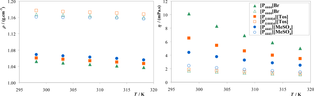 Measurements of viscosity and density were performed in the temperature range from 298.15 K to 318.15 K, and at atmospheric pressure, using an automated SVM 3000 Anton Paar rotational Stabinger viscometer-densimeter. Further details on the equipment can be found elsewhere [41]. The dynamic viscosity has a relative uncertainty within 0.35%, while the absolute uncertainty of the density is ±5 × 10−4 g·cm−3. Density and viscosity measurements were carried out at selected biphasic regions. Individual mixtures at the biphasic region were prepared by weight, vigorously agitated and allowed to reach the equilibrium by the separation of both phases for at least 12 h and at 298 K. The proper phase separation was noticeably indicated by the absence of turbidity in each phase. After the separation step, viscosity and density measurements were performed for both aqueous rich phases.