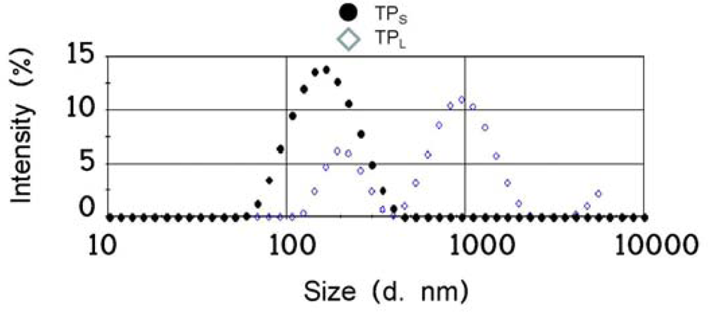 Particle size distribution of intensity measured, by dynamic light scattering analysis. Black circles show the size distribution of TPS, and open diamonds of TPL.