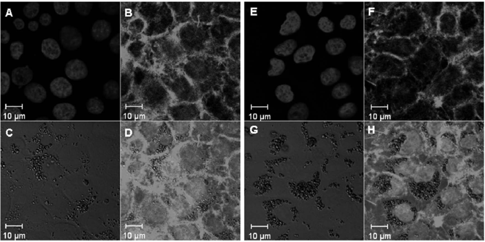 Microscopic images of TPS (A–D) and TPL (E–H)-exposed NCI-H292 cells. Titania particle-exposed cells were paraformaldehyde-fixed. Images represent the nucleus stained by Hoechst 33258 (A, E), F-actin stained by rhodamine-phalloidin (B, F), differential interference images to view titania particles (C, G), and merged images (D, H).