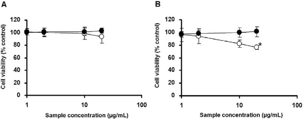 Cell viability test based on cytoplasmic ATP concentrations. THP-1 cells (A) or NCI-H292 cells (B) were exposed to each concentration of TPS (closed circle) or TPL (open circle). The results indicate mean ± SD, n ≥ 3 for each, *p < 0.01.
