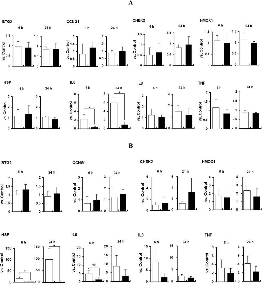 mRNA expression of stress- and toxicity- markers in TiO2 particle-exposed PMA-activated THP-1 cells (A) and NCI-H292 cells (B) (mean ± SD, n ≥ 3 for each). Cells were exposed to TPL (open bar) or TPS (solid bar) for 6 h or 24 h. mRNA expression was standardized by internal GAPDH (glyceraldehyde-3-phosphate dehydrogenase) expression and the relative expression level versus control (sterilized water added instead of TiO2 particles) is shown. Abbreviations: BTG2 (B-cell translocation gene 2), CCNG1 (cyclin G1), CHEK2 (CHK2 checkpoint homolog), HMOX1 (hemeoxigeanse 1), HSP (heat shock protein 70B′), IL6 (interleukin 6), IL8 (interleukin 8), TNF (tumor necrosis factor α). *p < 0.01, **p < 0.02.