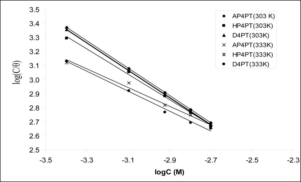The adsorption characteristics of the inhibitors were investigated by fitting the experimental data obtained for the degrees of surface coverage into different adsorption isotherms. The tests revealed that the adsorption of AP4PT, HP4PT and D4PT can best be described by the Langmuir adsorption isotherm. The Equation for the Langmuir adsorption isotherm can be written as follows [
