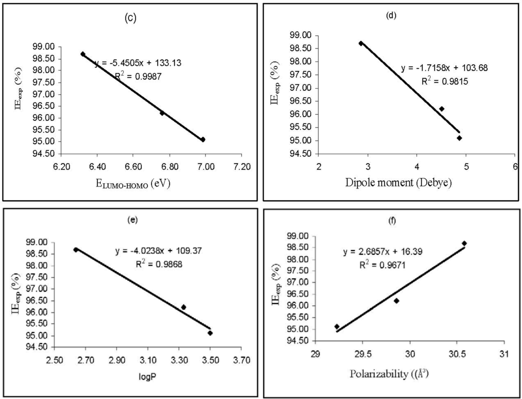 Figure 3 shows plots for the variation of the experimental inhibition efficiencies with some quantum chemical parameters. The figure reveals that the degree of linearity (
