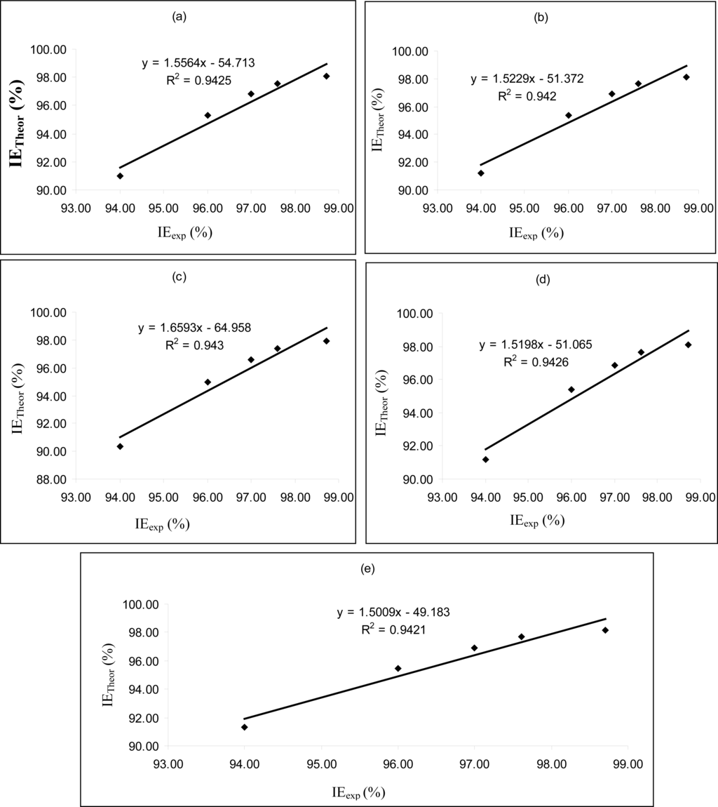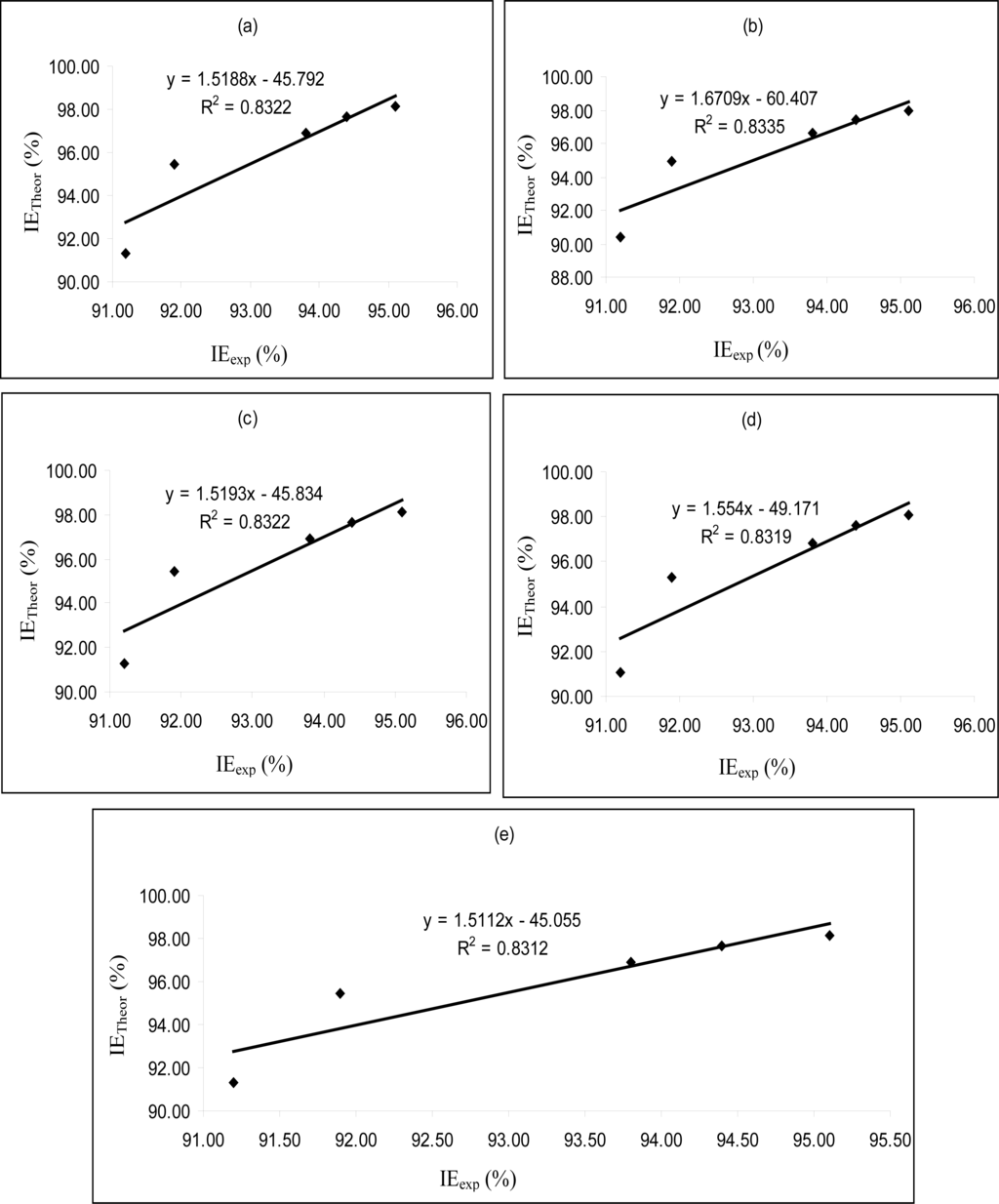 Table 5. From the results obtained, the highest degree of linearity between the experimental inhibition efficiencies and the