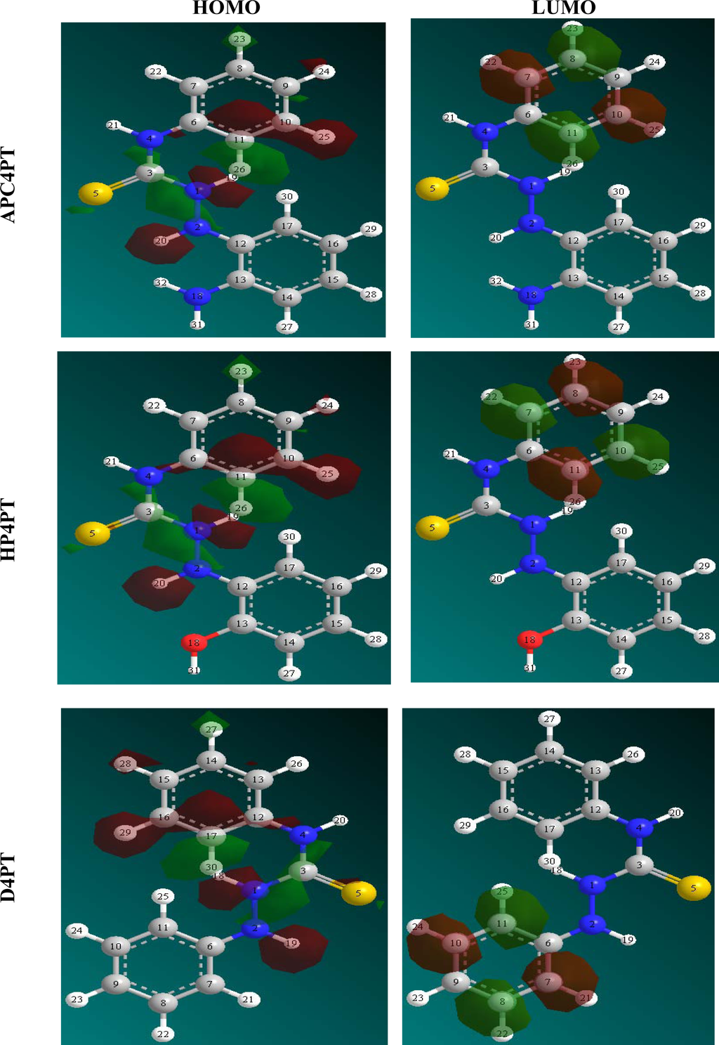 EHOMO for the inhibitors decreases in the order; (AP4PT > HP4PT > D4PT), which is consistent with the experimental % inhibition efficiency results. However, the