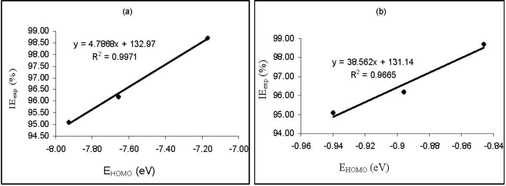 Most recent studies on the use of QSPR/QSAR for corrosion employ quantum chemical calculations as an attractive source of new molecular descriptor. According to Vera et al. [47], QSAR/QSPR can be used to relate the inhibition efficiency of most inhibitors to structural parameters (quantum and topological), which can be theoretically calculated with the ultimate aim of obtaining a molecular design of new corrosion inhibitors. El Ashry et al. [48] also stated that although the QSAR is a useful tool for the development of new corrosion inhibitors, the development of Equations for calculating the corrosion inhibition efficiency may lead to a prediction of the efficiency of some inhibitors.