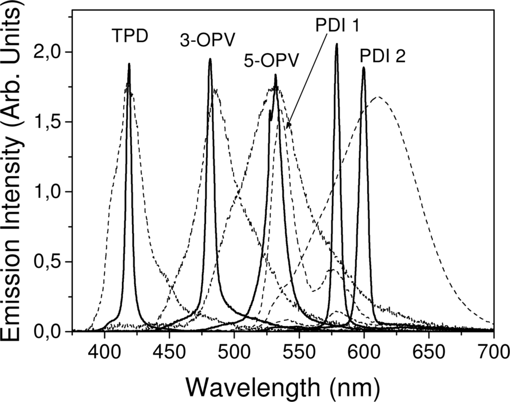 - Kretsch, KP; Blau, WJ; Dumarcher, V; Rocha, L; Fiorini, C; Nunzi, JM; Pfeiffer, S; Tillmann, H; Hörhold, HH. Distributed feedback laser action from polymeric waveguides doped with oligo phenylene vinylene model compounds. Appl. Phys. Lett 2000, 76, 2149–2151. [Google Scholar]