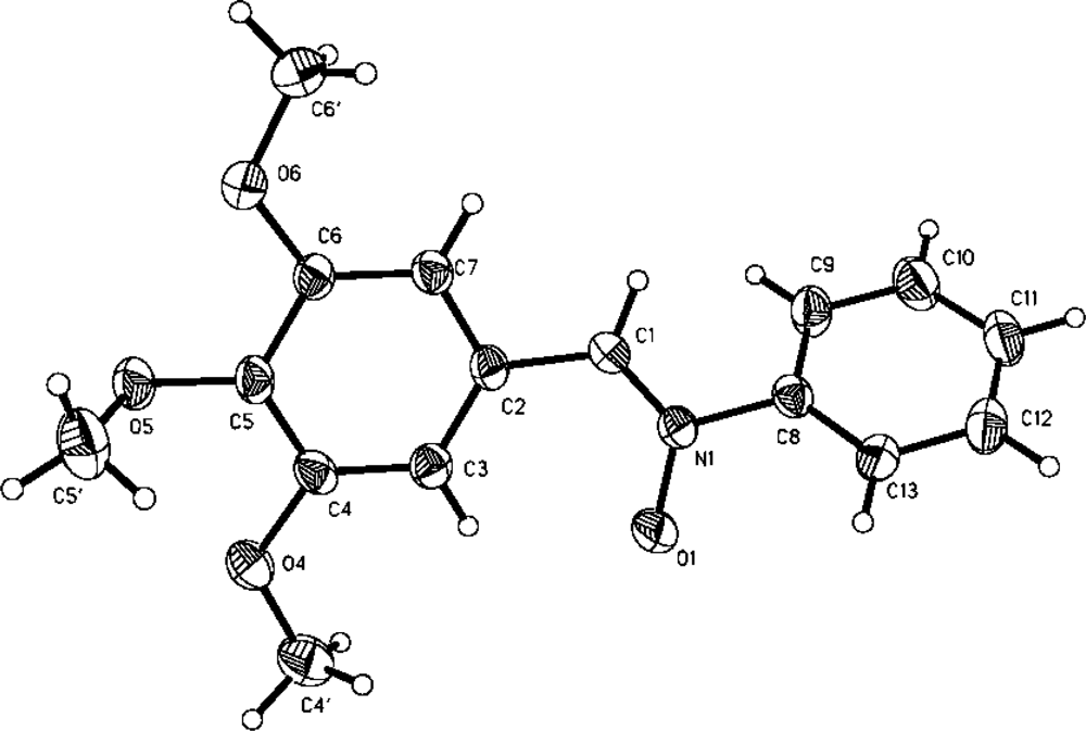 (Z)-N-(3,4,5-trimethoxybenzylidene) aniline oxide (3i). 78% yield; yellow solid, Mp 187 °C; 1H-NMR (300 MHz, CDCl3): δ 7.88 (s, 1H, N=CH), 7.79 (s, 2H, H-2’ and H-6’), 7.79-7.76 (m, 2H, H-2 and H-6), 7.50-7.47 (m, 3H, H-3, H-4 and H-5), 3.94 (s, 9H, OMe); 13C-NMR (75MHz, CDCl3): δ 153.1 (C-5’ and C-3’), 149.1 (C-1), 140.4 (C-4’), 134.7 (N=CH), 130.1 (C-4), 129.4 (C-3 and C-5), 126.3 (C-1’), 121.8 (C-2 and C-6), 106.6 (C-2’ and C-6’), 61.2 (p-OMe), 56.3 (m-OMe); EIMS (70 eV) m/z (% relative abundance): 227(50) [M]+·, 226 (80) [M-1]+, 210 (100) [M-OH]+.