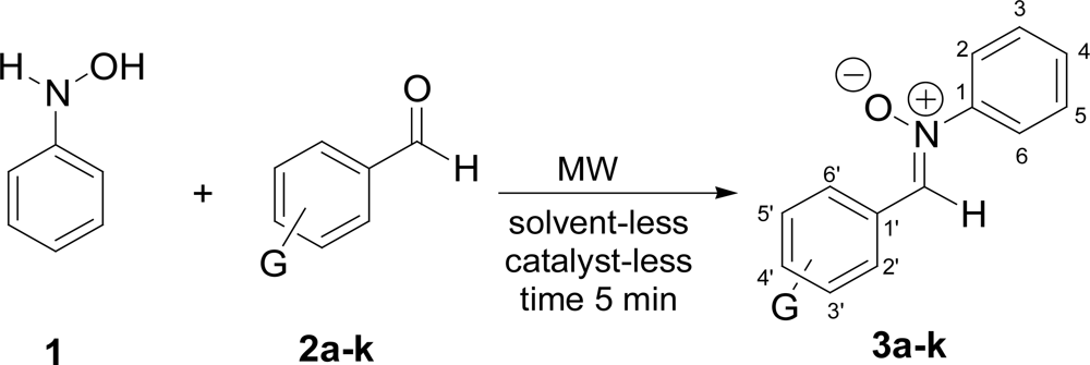 In view of the potential importance of arylnitrones, and considering the limitations of existing methods, a green contribution is presented in this work. The method involves the microwave irradiation of a mixture of phenylhydroxylamine (1) and an aromatic aldehyde (2a–k) under solvent-free conditions and, moreover, without an environmentally non-benign catalyst (Scheme 1). The target is to produce in a stereoselectively form a series of eleven benzylideneaniline oxides (3a–k). The corresponding condensation results are summarized in Table 1. As can be seen, the target molecules were produced in a very short time, in comparison to those methods previously reported, with good yields. The products were achieved with good purity after ethanol washing of the reaction mixture. Consequently, this procedure offers a simple work up.