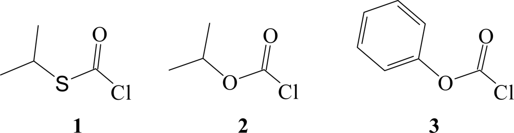 Molecular structures of s-isopropyl chlorothioformate (1), s-isopropyl chloroformate (2), and s-phenyl chloroformate (3).
