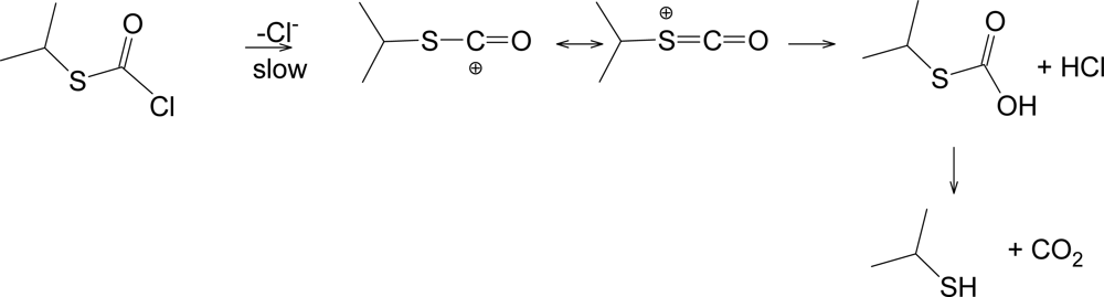 Unimolecular step-wise hydrolysis of isopropyl chlorothioformate (1).