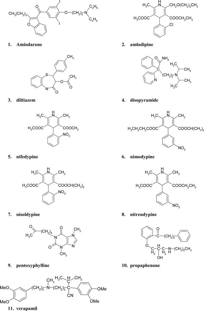 In all experiments, the following drugs were investigated: amiodarone (1), diltiazem (3), disopyramide (4), nifedypine (5), pentoxyphylline (9), propaphenazone (10) and verapamil (11) all from Polpharma S.A., Starogard Gdański, Poland; amlodypine (2) from Pfizer US Pharmaceutical Group, New York, NY, USA; nimodypine (6), nisoldypine (7) and nitrendypine (8) all from Bayer, Leverkusen, Germany.
