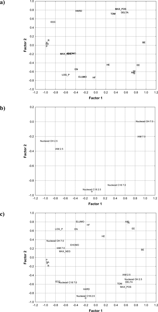 Two-dimensional scatter plots of the loadings of the first two factors: a) by structural parameters, b) by HPLC retention data, c) by structural parameters along with HPLC retention data.