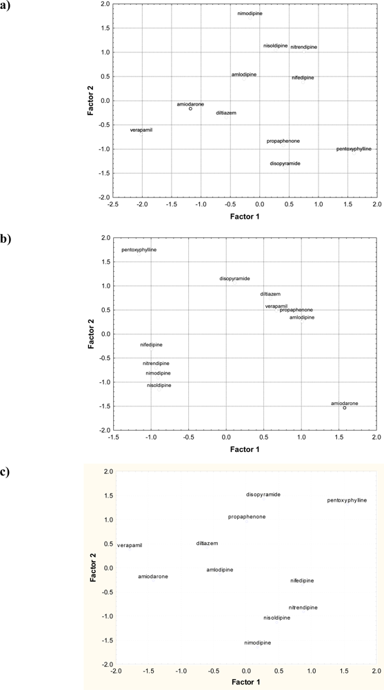 The positions of particular compounds on the plane determined by factors 1 and 2 obtained by HPLC retention data is presented in Figure 3b. On the scatter diagram, two main and close clusters were observed. The first cluster, with negative values of factor 1 factor 2, contains nifedipine, nimodipine, nisoldipine, nitrendipine as 2,6-dimethyl-4-phenyl-1,4-dihydropyridine-3,5-dicarboxylate derivatives with a nitro- group attached to position 2 or 3 of phenyl moiety, and belongs pharmacologically to the dihydropyridine class selective calcium channel blockers with lack of antiarrhythmic activity and additionally characterized by antihypertension activity (Table 1). The second cluster, with positive values of factor 1 factor 2, formed by diltiazem, verapamil, propaphenone, amlodipine and disopyramide further away, and linked compounds with sodium or calcium channel blockers activity and antiarrhythmic activity (exclude amlodipine with lack of antiarrhythmic activity), and also antihypertension activity (Table 1). However, there are two drugs, pentoxyphylline and amiodarone, not classified to the two proposed main clusters. The latter compound belongs to α-receptors and potassium channel blockers with antiarrhythmic activity, whereas pentoxyphylline is characterized only by blood vassels activity.