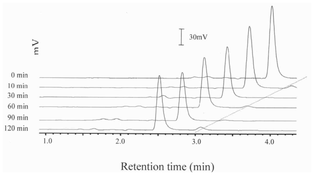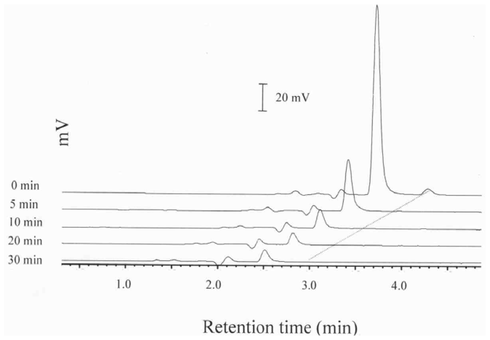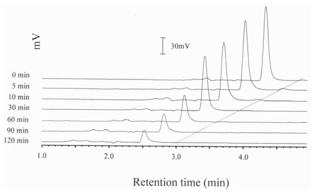 HPLC chromatograms of quercetin during heating at 150 °C under combination of oxygen and cholesterol.