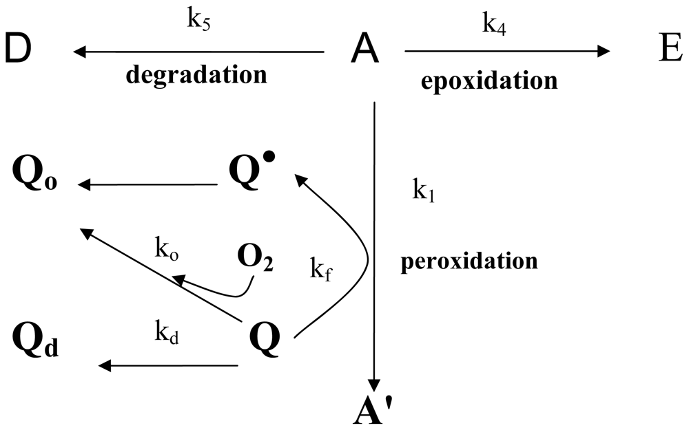 The possible pathways for quercetin degradation and oxidation as well as cholesterol peroxidation during heating at 150 °C. Cholesterol (A); 7-hydroperoxycholesterol (A′); 5,6-epoxycholesterol (E); degraded products (D); quercetin (Q); degraded plus oxidized product of quercetin (Qd, Qo); quercetin free radical (Q•). k1, k4, k5, ko, kd, and kf are the corresponding rate constants.