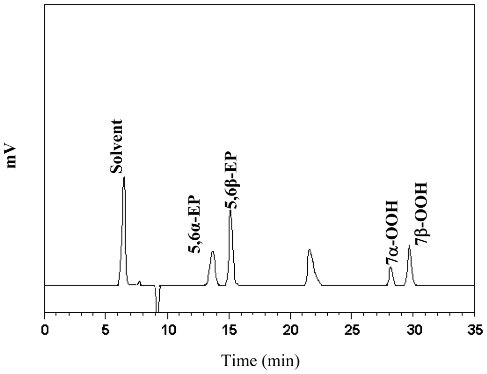 Due to absence of cholesterol hydroperoxide standards, both 7α-OOH and 7β-OOH should be identified and quantified with care. According to Smith and Hill [18], both 7α-OOH and 7β-OOH could turn red after spraying N,N-dimethyl-p-phenylenediamine dihydrochloride onto a TLC plate. Both 7α-OOH and 7β-OOH were further subjected to HPLC analysis for identification. Figure 6 shows the HPLC chromatogram of the acetone extract of the red spots collected from TLC after heating cholesterol with quercetin for 30 min. A total of 5 peaks were present, in which 5,6α-EP, 5,6β-EP, 7α-OOH and 7β-OOH were identified. Both 7α-OOH and 7β-OOH were tentatively identified based on the retention behavior as described by Chien et al. [17].