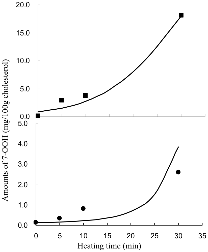 The amounts of 7-OOH (7α-OOH plus 7β-OOH) formed during heating of cholesterol with and without quercetin at 150 °C. Means of experimental data of cholesterol in the absence of quercetin (■), and cholesterol in the presence of quercetin (●); the best fitting line (—).
