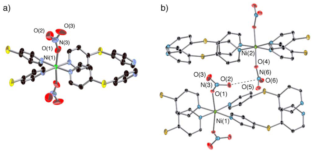 Synthesis of [Ni(dps)2(NO3)2] (2a). A methanol solution (25 mL) of dps (190 mg, 20 mmol) was allowed to diffuse into an methanol solution (25 mL) of Ni(NO3)2·6H2O (290 mg, 20 mmol) at room temperature. The obtained crystals were collected by filtration. Anal. Calcd for C20H16N6NiO6S2: C, 42.96; H, 2.88; N, 15.03. Found: C, 42.51; H, 3.02; N, 14.99.