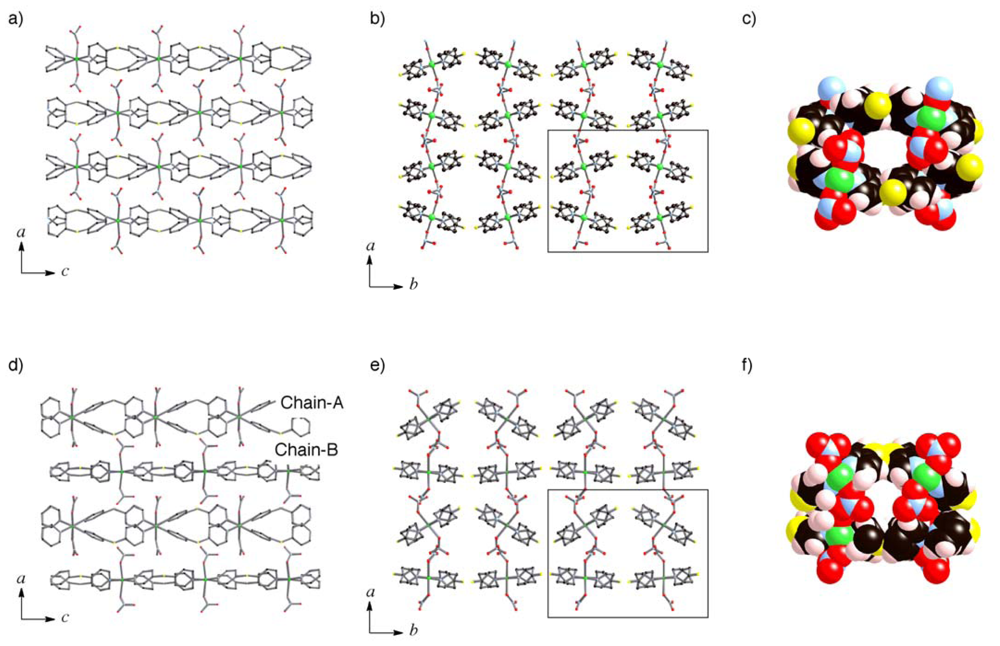 Crystal structures of 1α (a-c) and 1β (d-f). Ethanol molecules in the channels of 1β are omitted for clarity. Stacking structures of (Ni-dps2) chains along the b axis (a, c, d, f) and c axis (b, e) are exhibited. The channel formed by surrounding four chains is indicated by the rectangles in (b) and (e). Their channel structures with van der Waals radii are revealed in (c) and (f). Except for (c) and (f), the hydrogen atoms are omitted for clarity.