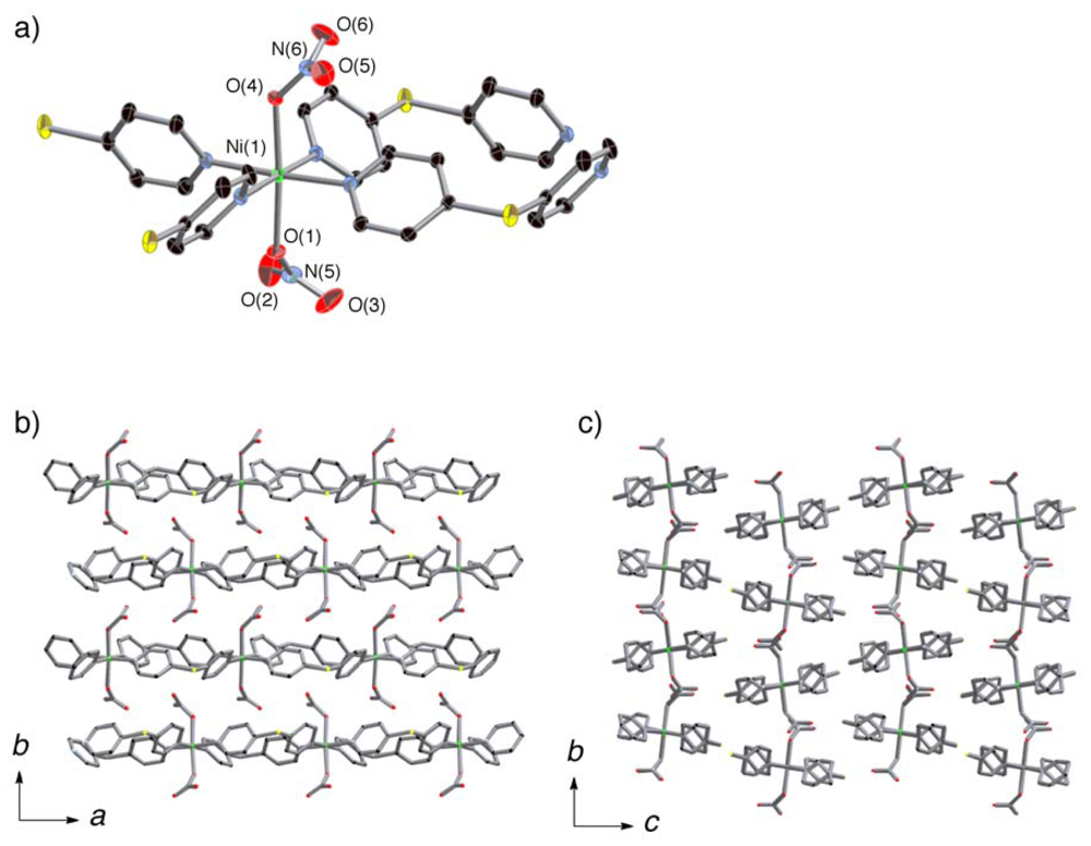 Coordination circumstance of Ni center of 2a (a). Views of stacking aspect of (Ni-dps2) chains of 2a in the ab plane (b), and assembled pattern of the chains along the c axis (c). Hydrogen atoms are omitted for clarity.