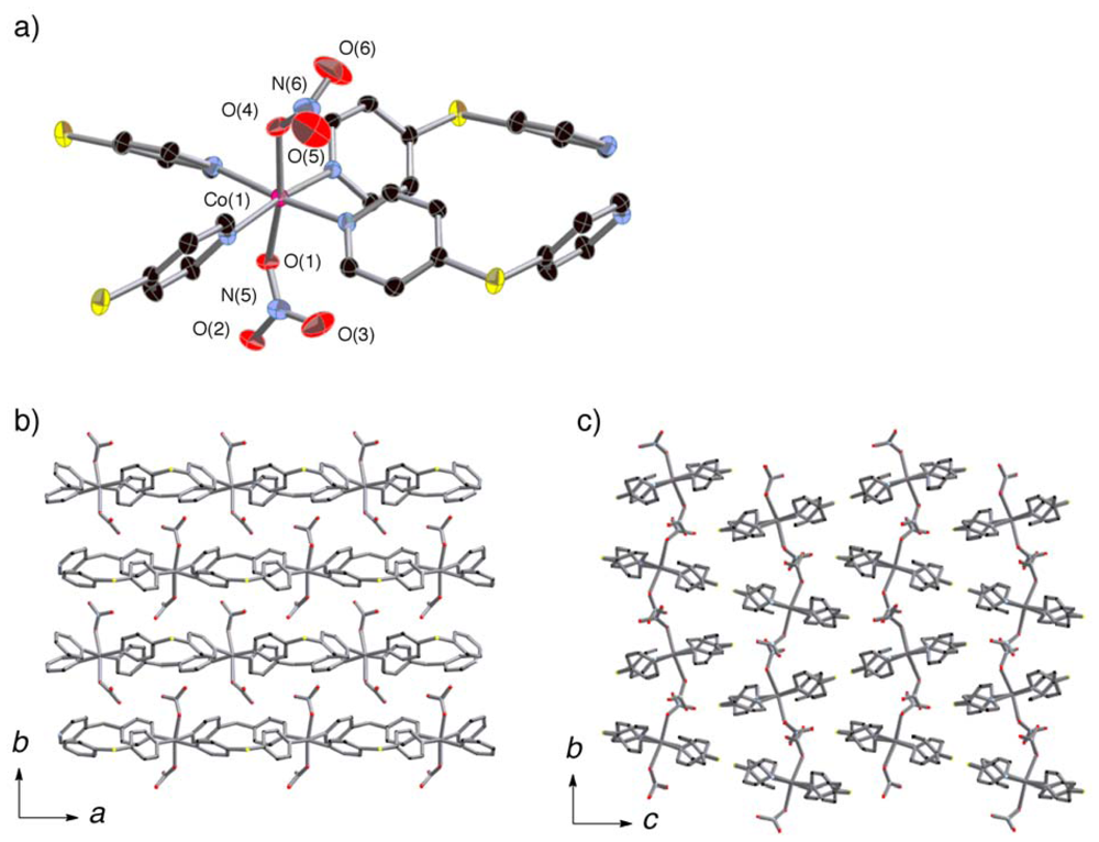 Coordination circumstance of Co center of 3 (a). Views of stacking aspect of (Co-dps2) chains of 3 in the ab plane (b), and assembled pattern of the chains along the c axis (c). Hydrogen atoms are omitted for clarity.