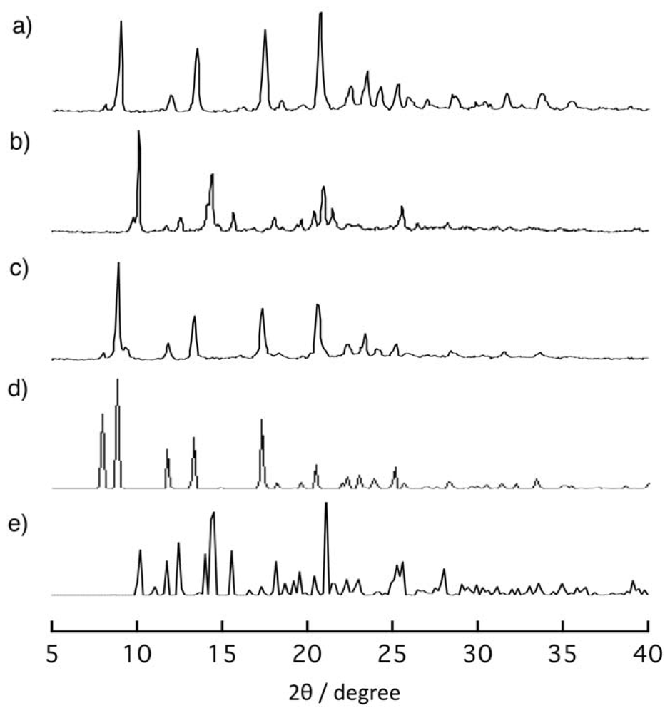 X-ray powder diffraction (XRPD) patterns of solid sample of 1 (a), its dried sample obtained on heating at 130 °C under reduced pressure (b), and the powder obtained by exposure of EtOH vapor to the dried sample (c) for three days. The simulation patterns based on the crystal structural analysis of 1α (d) and 3 (e).