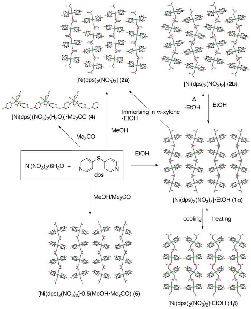 Scheme 2 summarizes the structures and rearrangement of the (Ni-dps2) chains in Ni-dps compounds. The views are illustrated along the one-dimensional chain direction except for 4. Reaction of Ni(NO3)2·6H2O with dps in EtOH or MeOH produced coordination polymers 1 and 2a, which were constructed by stacks of (Ni-dps2) chains. 1 had two structural phases that reversibly transformed depending on the temperature about -12 °C. The two structural phases observed above and below the critical temperature were designated as 1α and 1β Immersion of a solid sample of 1 into m-xylene released guest EtOH molecules, and converted 1 to 2a. On the other hand, removal of the guest EtOH molecules from single crystals of 1 on heating at 130 °C under reduced pressure produced dried compound 2b as a crystalline solid. Although the data quality was poor due to the cracks, 2b was useful for single crystal X-ray analysis. This means that the guest removal reaction proceeded by the single-crystal-to-single-crystal process []. The dried compound 2b reproduced 1 by exposure to EtOH. Although 2a and 2b are guest-free coordination polymers with the same formula, their stacking patterns of (Ni-dps2) chains are different, meaning that 2b is an allotrope of 2a. While 2b converted to 1 reversibly, 2a did not convert to 1 in a similar reaction condition.