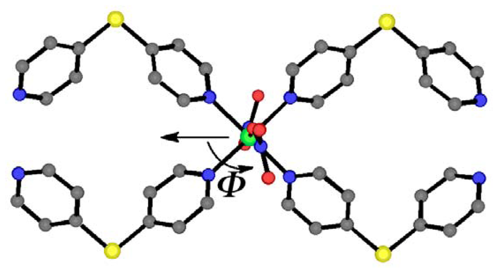 The most significant effects of this phase transition on the porous structures are established by the rotation of the coordinating nitrate anions. When the angle of the NO3 plane of the coordinating anion to the channel direction, which is parallel to the c axis, is defined as Φ (Scheme 3), the angles of nitrate anions in 1α are about 45° (and −45°). However, the Φ of nitrate anions in 1β is about 80° (and −80°) for Chain-A, and 15° (and −15°) for Chain-B, respectively. That is, the planes of the nitrate anions of Chain-A are nearly perpendicular to the channel direction. The rotations jutted the nitrate anions into the channels, which resulted in the change of channel shape from “compressed hexagon” in 1α to “T-shape” (5 × 2 + 2 × 3 Å) in 1β. The structural transformation narrowed the channel width from about 5 to 2 Å for the lower half of the channel window. This second phase with diminished channels is regarded as the closed porous phase induced by the temperature switch. In the previous communication, we showed that the including EtOH molecules were securely captured in the closed channels [].