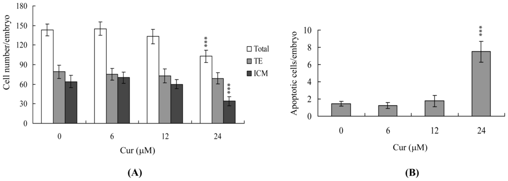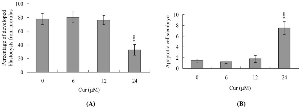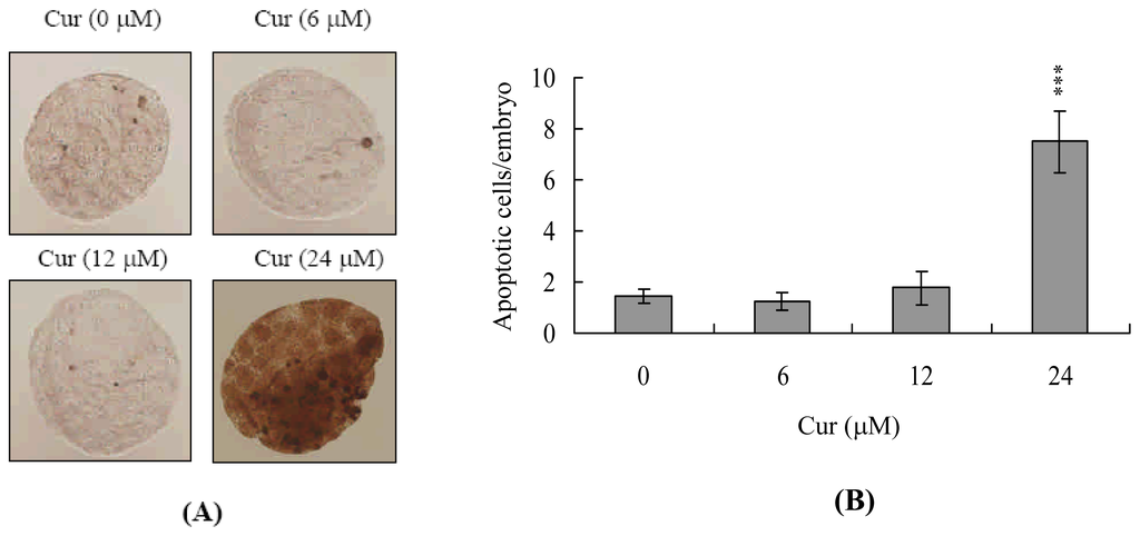 Curcumin, a common dietary pigment and spice, is a hydrophobic polyphenol derived from the rhizome of the herb Curcuma longa that is used as a traditional Indian medicine [] for the treatment of wounds, liver ailments, hepatitis and urinary tract diseases, as well as a cosmetic compound []. Curcumin exerts a wide range of pharmacological effects, including anti-inflammatory, anti-carcinogenic, hypocholesterolemic and anti-infection activities [–]. As a potential antioxidant, curcumin displays anti-proliferative and anti-carcinogenic properties in a variety of cell lines and animals [–]. Moreover, the efficacy of curcumin in various diseases, including cancer, is well established []. Recent studies have shown that the anti-tumor activity of curcumin is attributed to its ability to induce apoptosis via caspase-3 activation [,]. Moreover, various in vivo animal assay models and human studies confirm that dietary curcumin is extremely safe and does not exert hazardous effects, even at high doses [–]. For example, three separate phase I clinical trials demonstrate that dietary curcumin administered at doses as high as 12 g per day is well tolerated [–]. Curcumin displays high pharmacological safety and efficacy, and is thus a potential candidate agent for the treatment and prevention of a wide range of human diseases. Importantly, a recent study by our group shows that curcumin inhibits methylglyoxal-induced reactive oxygen species (ROS) generation and various apoptotic biochemical events in embryonic stem cells and blastocysts isolated from pregnant mice []. Moreover, another study by our group focusing on the possible effects of curcumin on ROS generation, intracellular adenosine triphosphate (ATP) levels and cell death mode in osteoblast cells revealed that curcumin induces apoptosis or necrosis in a dose-dependent manner []. However, while multiple biological functions have been identified for curcumin, the ambiguous issue of its activity as an apoptotic inducer or inhibitor and the precise molecular mechanisms underlying these actions are yet to be fully determined. To date, virtually no studies have investigated the potential of curcumin as a cytotoxic agent against embryo development.