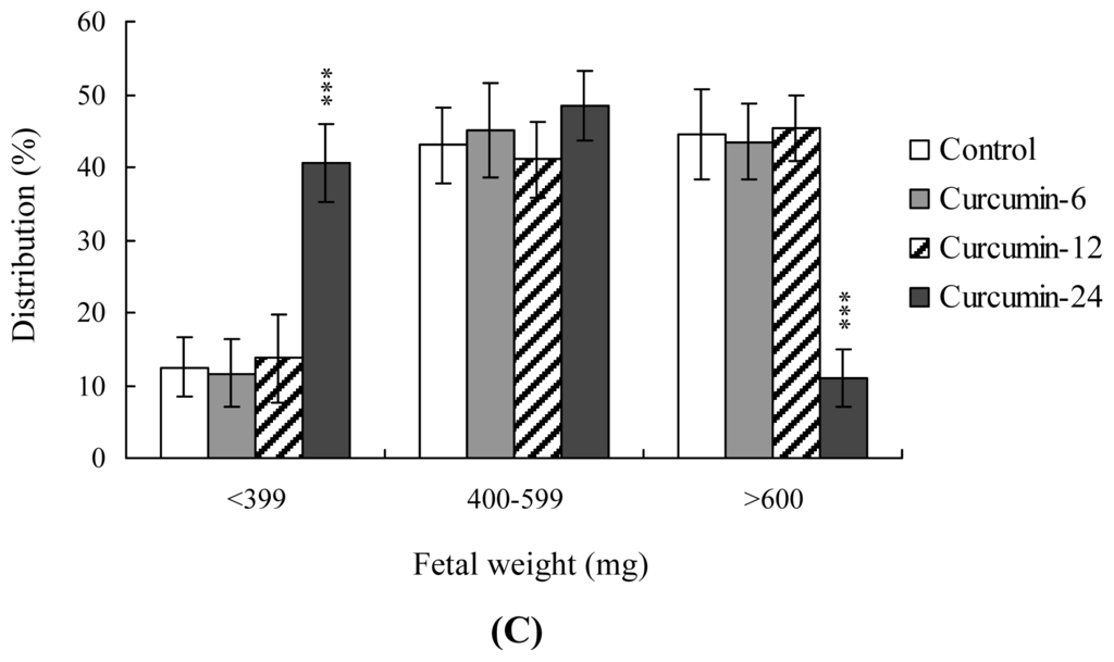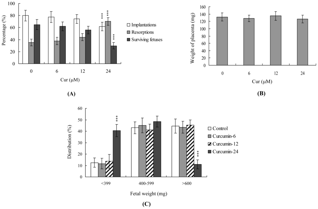 To further determine the effects of curcumin on blastocyst development in vivo, we transferred mouse blastocysts subjected to curcumin pretreatment or left untreated, and examined the uterine content at 13 days post-transfer (day 18 post-coitus). The implantation ratio in the curcumin-pretreated group (24 μM) was significantly lower than that of the untreated control group (Figure 4A). In addition, embryos that implanted but failed to develop were subsequently resorbed. Early resorption was visualized as small dark moles with no distinct structures, whereas late resorptions resembled placentas with no fetal structure. The proportion of implanted embryos that failed to develop normally (early and late resorption groups) was significantly higher in the 24 μM curcumin-pretreated group versus the control group (Figure 4A). Interestingly, no differences in placental weight were evident between the curcumin-treated and untreated groups (Figure 4B), but fetal weight was lower in the curcumin-treated group. Moreover, previous and recent experiments by our group reveal that 35–40% of fetuses weigh more than 600 mg, with the average weight of total surviving fetuses being ~600 ± 12 mg in the untreated control group at day 18 of pregnancy in a mouse embryo transfer assay [,–]. Fetal weight is an important indicator of developmental status, and the average fetal weight of the untreated control group was thus used as a key indicator for measuring the development status of curcumin-treated blastocysts. The results show that only about 11% of the fetuses in the 24 μM curcumin-pretreated group weighed more than 600 mg (an indicator of successful embryonic and fetal development), in contrast to 44% of control fetuses (Figure 4C). Thus, curcumin exposure at the blastocyst stage poses a potential risk to postimplantation development.