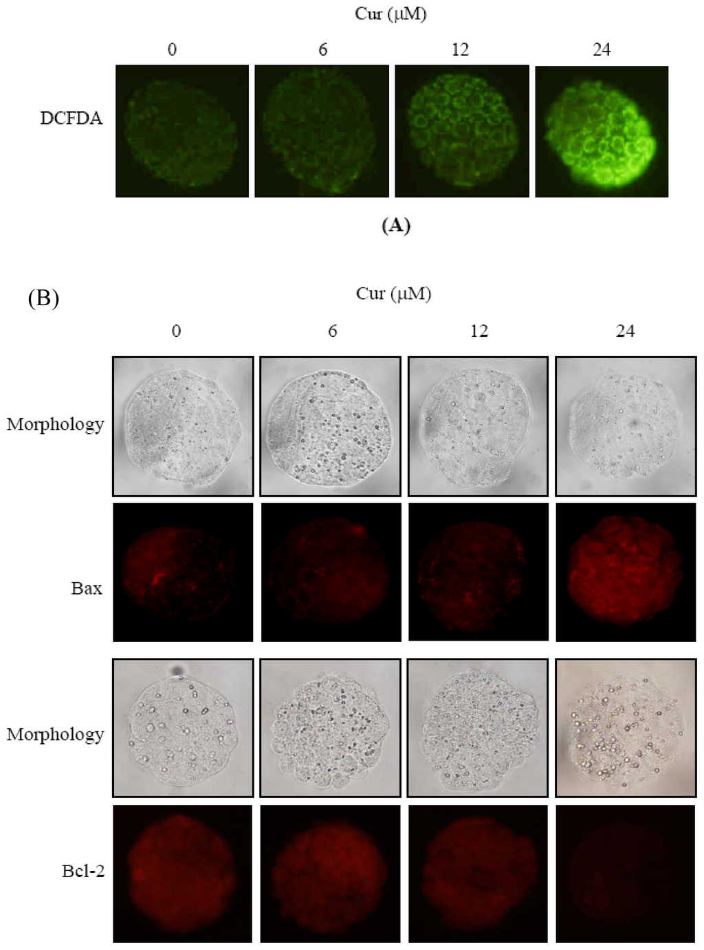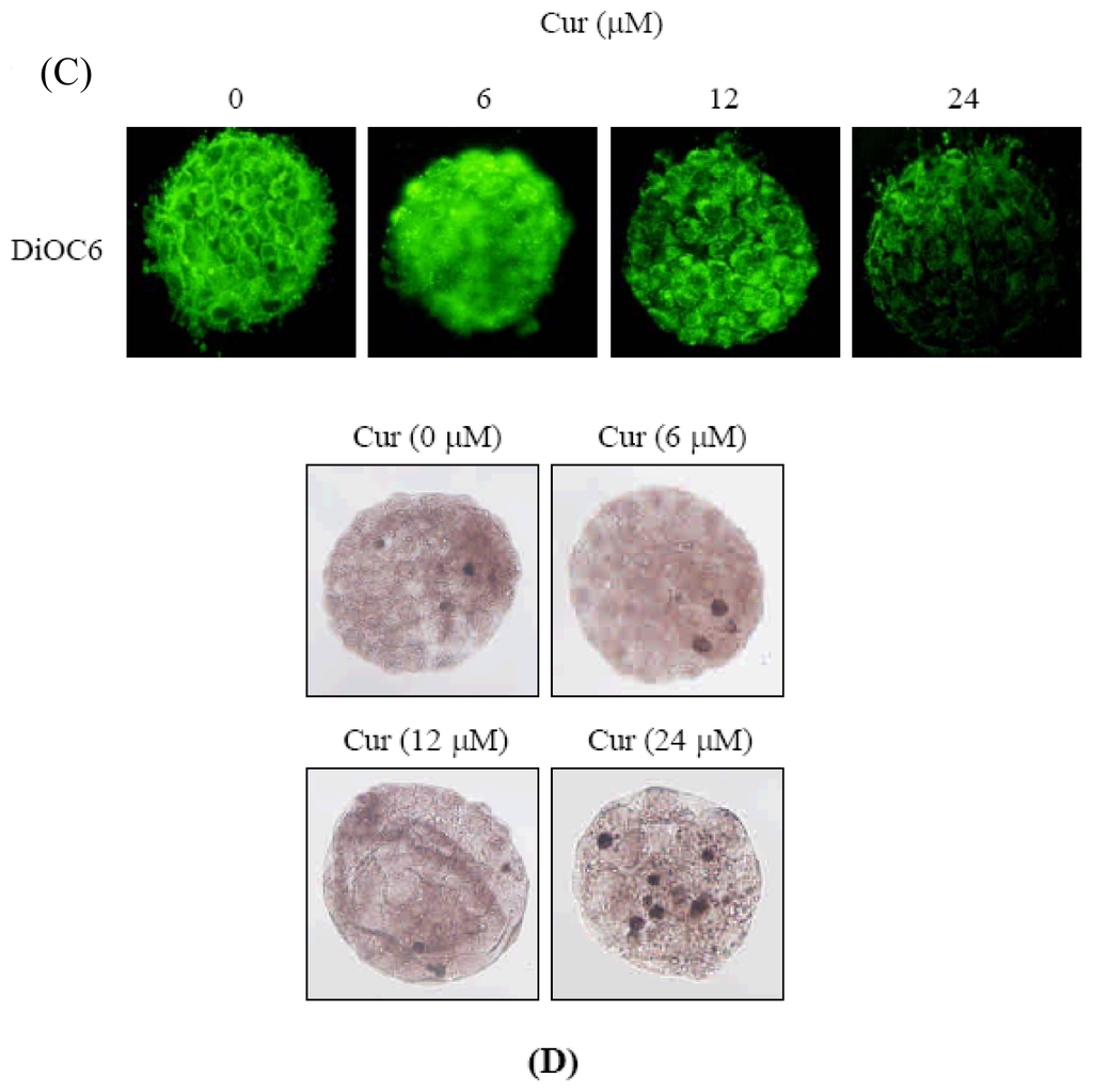 Effects of curcumin on ROS generation and mitochondria-dependent apoptotic processes in mouse blastocysts. Mouse blastocysts were treated with curcumin (Cur, 6, 12 or 24 μM) or left untreated for 24 h. (A) ROS generation was detected by staining with 20 μM DCF-DA fluorescence dye. (B) Bax and Bcl-2 expression levels were determined by immunostaining with anti-Bax and anti-Bcl-2 antibodies, respectively. The protocol is described in “Materials and Methods”. (C) To examine mitochondrial membrane potential changes, embryos were incubated with 40 nM DiOC6(3) at 37 °C for 1 h and analyzed under a fluorescence microscope. (D) Activation of caspase-3 was analyzed by immunostaining with anti-activated caspase-3 antibody for 3 h, followed by a secondary antibody conjugated with peroxidase (1:100) for 1 h. Finally, 20 μL of DAB-substrate solution was added to embryos, and incubated for 2 min at room temperature. Cells with activated caspase-3 are presented in black.