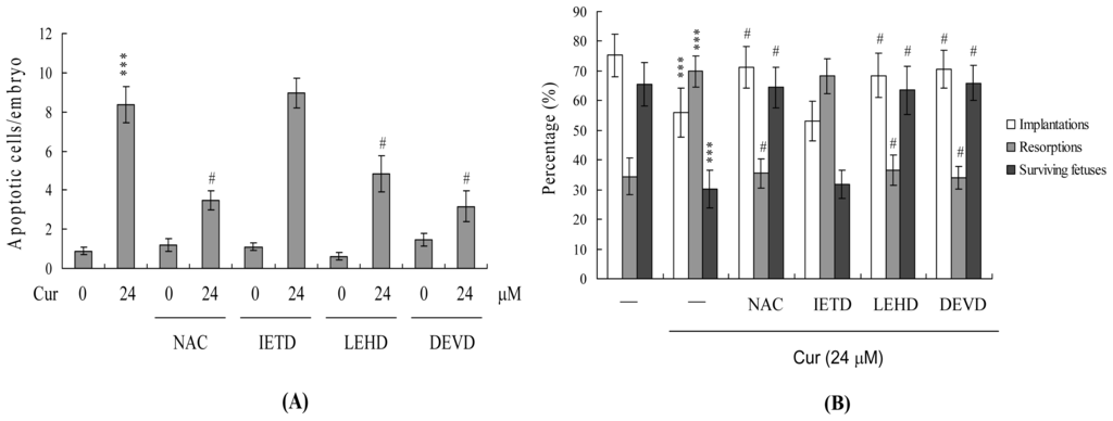 In summary, we show for the first time that curcumin induces apoptosis only in the ICM of mouse blastocysts through ROS- and mitochondria-dependent pathways, leading to decreased embryonic development and viability. These findings imply that curcumin is a potential hazardous risk factor for normal embryonic development.
