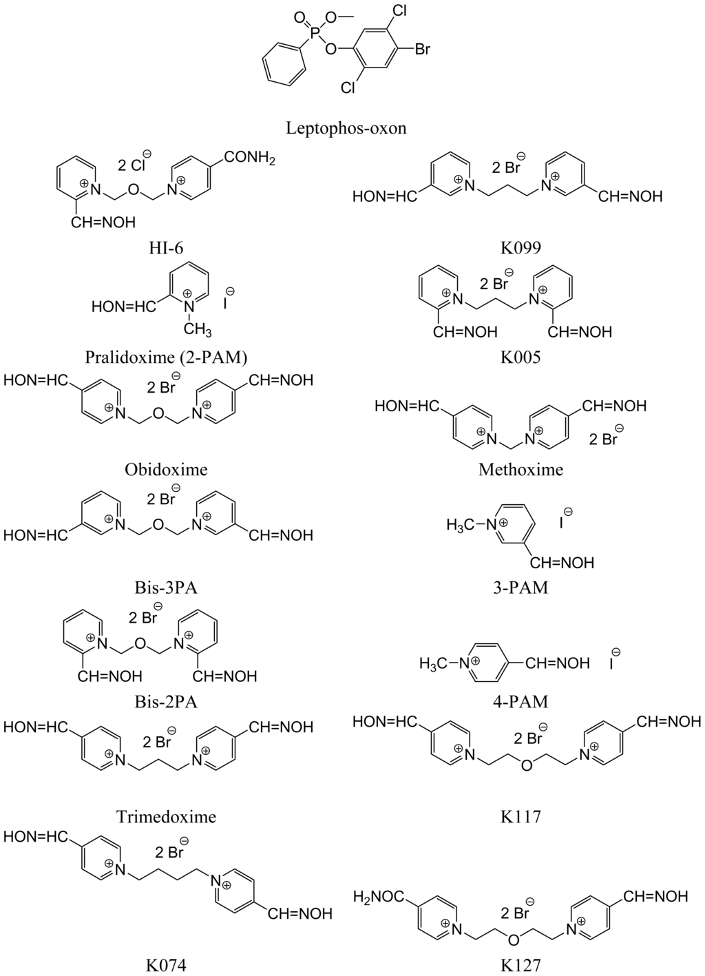 Structure of leptophos-oxon and tested oxime reactivators.