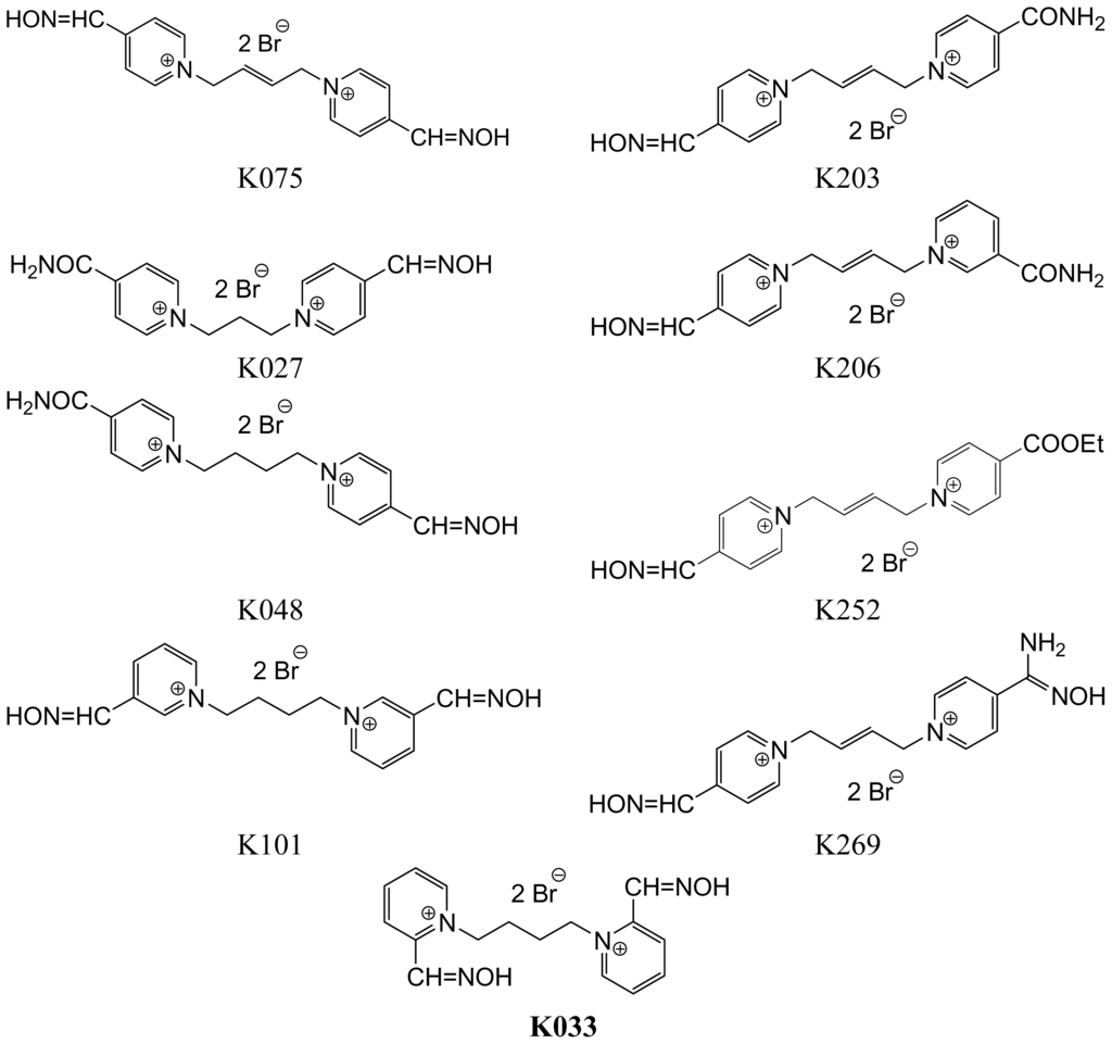 - Kuca, K; Musilova, L; Palecek, J; Cirkva, V; Paar, M; Musilek, K; Hrabinova, M; Pohanka, M; Karasova, JZ; Jun, D. Novel bisquaternary oximes--reactivation of acetylcholinesterase and butyrylcholinesterase inhibited by paraoxon. Molecules 2009, 14, 4915–4921. [Google Scholar]