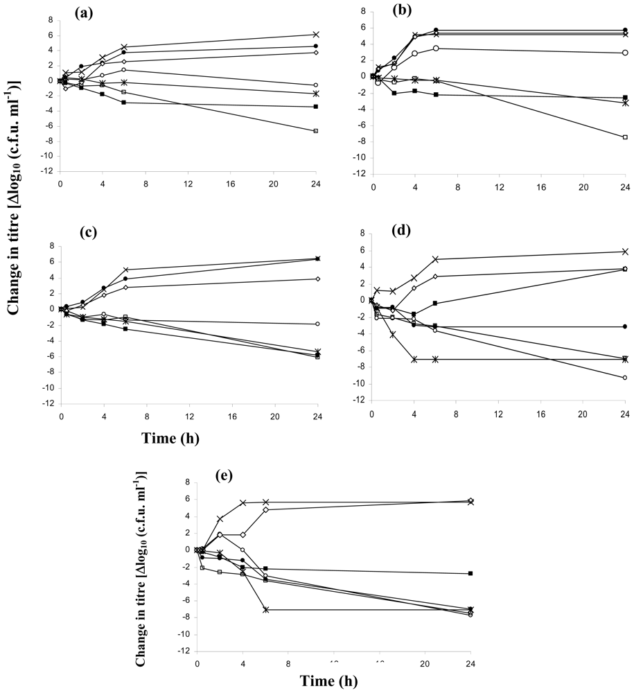 The bactericidal activities of the antimicrobial dressings against five microorganisms. Values are the means of three experiments performed in triplicate. Δlog10 c.f.u. ml−1 is the difference in Δlog10 c.f.u. ml−1 at the time of bacterial inoculation, starting from t = 0. Strains: (a) Methicillin-sensitive Staphylococcus aureus (ATCC 6338P); (b) Methicillin-resistance Staphylococcus aureus (ATCC 25923); (c) Bacillus subtilis (ATCC 6633); (d) Pseudomonas aeruginosa (ATCC 27853); (e) Escherichia coli (ATCC 25922) and □ represents Acticoat®; ○ represents Aquacel Ag®; * represents Askina Calgitrol Ag®; ■ represents Bactigras®; • represents Urgotul SSD®; ⋄ represents Mepitel® and × represents growth control.